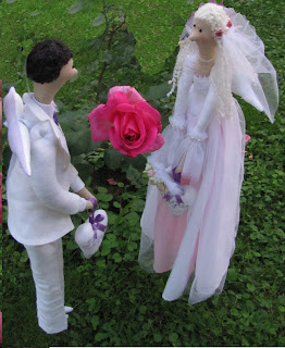 Невеста - тело- тонированный лен, платье из батиста с вставками из шелка, хлопчатобумажные кружева, фата и верхняя юбка из французского тюля. Цветы на корсаже и в волосах- вышивка нитками DMC. Прическа невесты- шерстяное букле. Глазки- стеклянные бусинки.